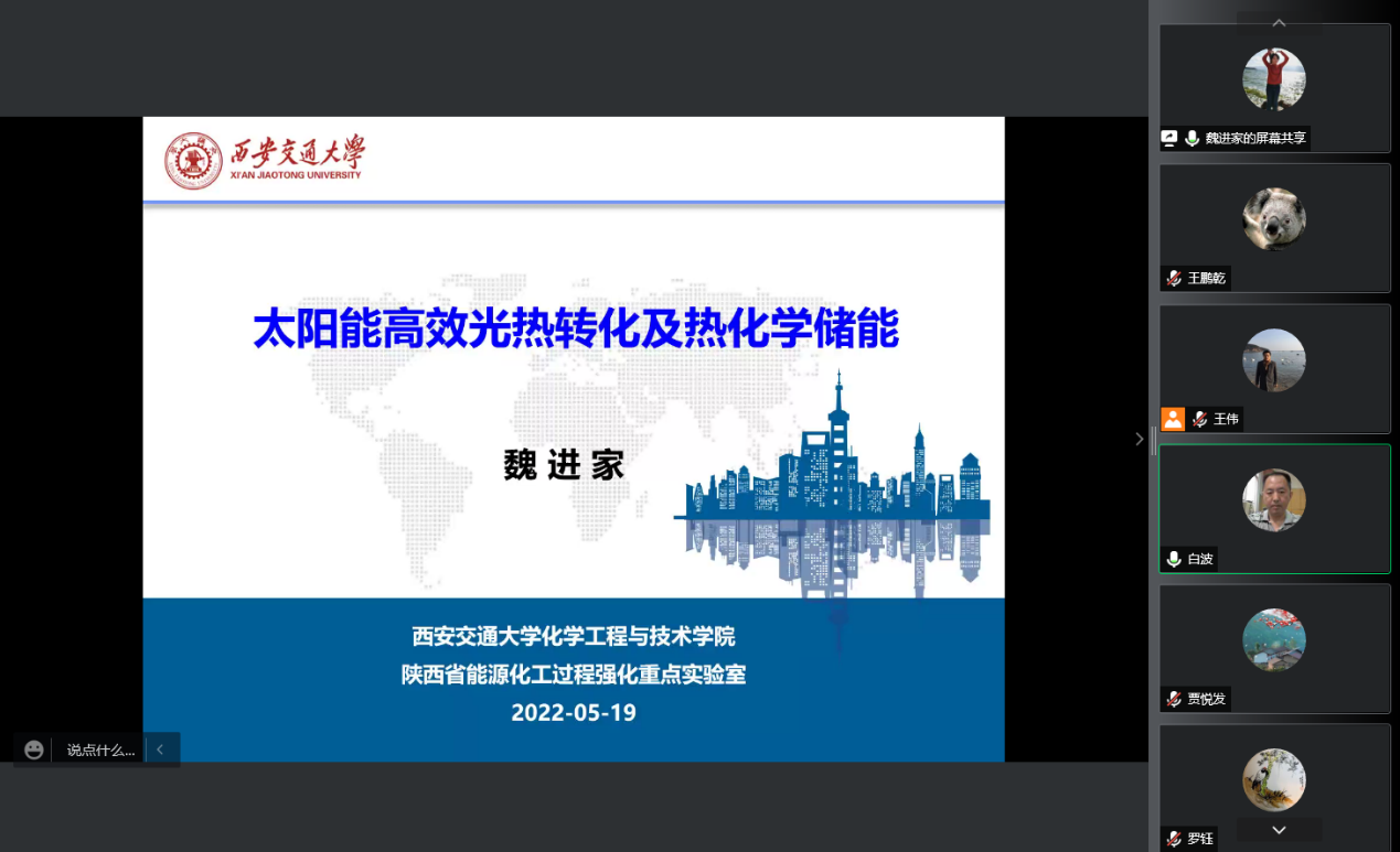 2022年5月19日下午,西安交通大学化学工程与技术学院魏进家教授受邀通过腾讯会议为澳门网投官方网站的老师和研究生做了“太阳能高效光热转化及热化学储能”的学术报告,报告由学院院长白波主持,学院相关教师和研究生90余人参加了会议。