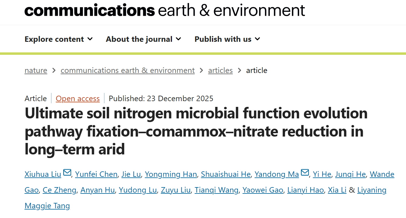 1223日,澳门网投官网澳门网投官方网站刘秀花教授团队在Nature子刊《地球与环境通讯》(Communications Earth & Environment)发表题为“Ultimate soil nitrogen microbial function evolution pathway fixation–comammox–nitrate reduction in long–term arid” 的最新研究成果。该成果首次证明:在长期干旱压力下土壤微生物群落为适应氮素限制演化出一条独特的终极功能路径:固氮-完全氨氧化-硝酸盐还原循环。澳门网投官方网站黄土科学国家重点实验室为论文第一完成单位,刘秀花教授与陕西省林科院马延东副研究员为共同通讯作者合作者包括中科院地环所韩永明研究员、澳大利亚纽卡斯尔大学Maggie Tang副教授