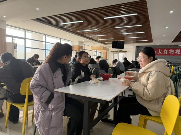 各年级辅导员分别邀请了学生代表在食堂共进午餐,在轻松愉快的氛围中进行了更深入的交流。餐桌上,辅导员们详细了解了同学们上学期的考试情况、本学期的学习计划、学业困难情况以及对未来发展的初步思考。对于即将面临毕业选择的高年级学生,交流则侧重就业进展、实习情况,特别询问了大四考研初试成绩自我评估、心理状态以及后续复试或调剂的准备情况,并结合往届案例和当前形势,为同学们提供了针对性的建议、信息渠道和心理疏导。