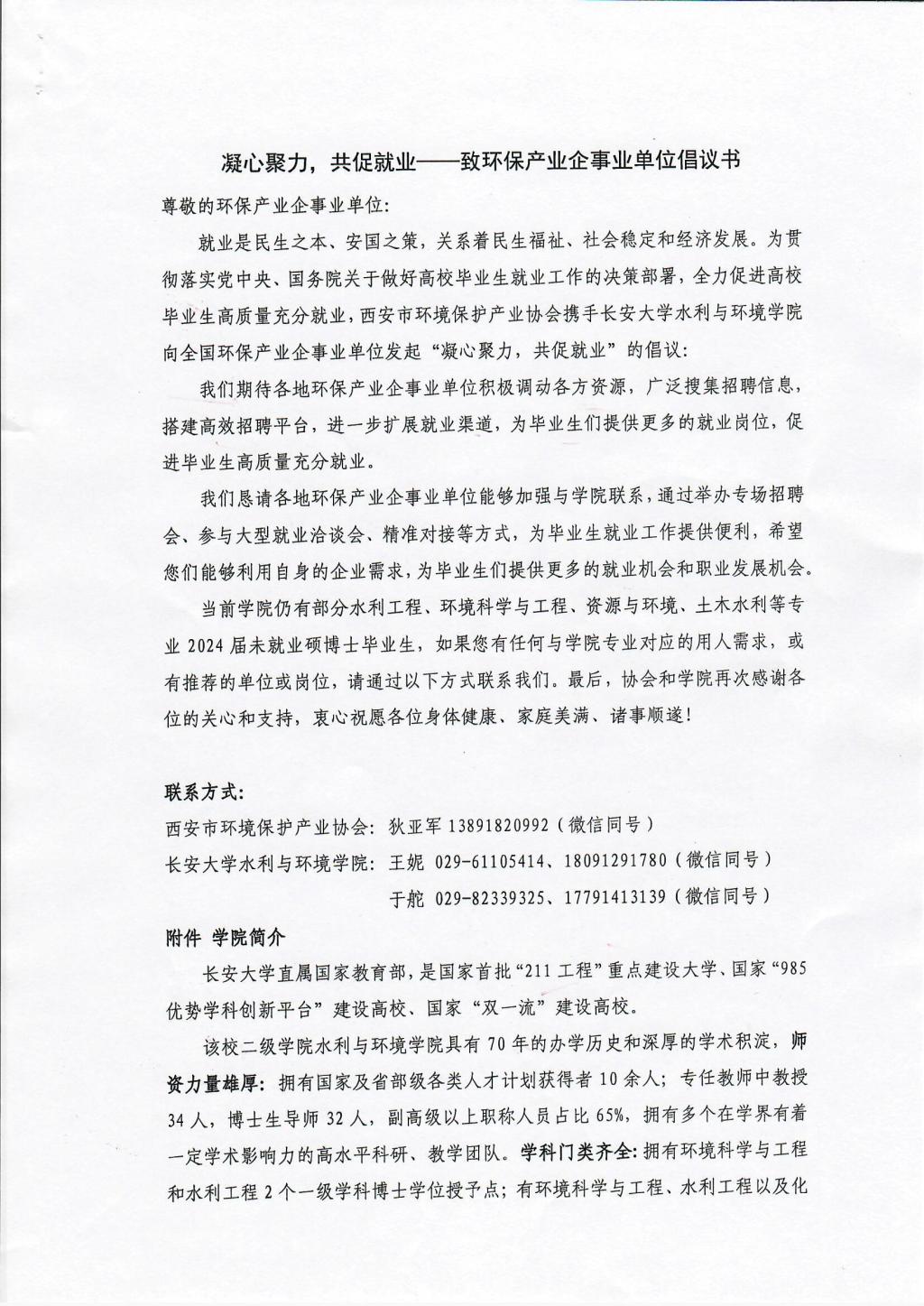 凝心聚力,共促就业——致环保产业企事业单位倡议书